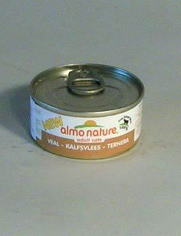 Almo Cat Nature Classic konz. kočka telecí - je kompletně přírodní konzerva s kousky telecího masa. Skládá se z masa/ryb (mezi 50 a 75 %), vlastní šťávy a rýže. Do těchto krmiv se nepřidávají minerály a vitaminy, protože už obsahují přirozeně bohaté zdroje těchto látek.