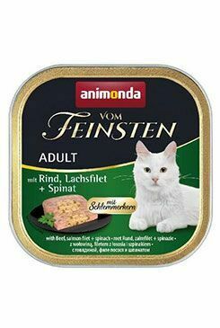Vom Feinsten Adult Gourmet Center s hovězím masem, filetem z lososa a špenátem poskytuje dospělým kočkám všechny základní živiny, které potřebují. Značka krmiva pro kočky Vom Feinsten nabízí řadu různých vynikajících konzistencí, díky nimž srdce koček bije rychleji: ať už paštiky, varianty se speciálním středem, suché krmivo nebo pěna – čtyřnozí fajnšmekři se mohou každý den nechat hýčkat širokou škálou požitků.