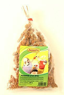 Senegalské proso v klasech. Výborná pochoutka, která zabaví veškeré exoty. Určeno k zavěšení do voliéry nebo klece.