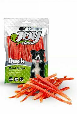 Masový pamlsek Calibra Joy pro psy - proužky z kachního masa s vysokým obsahem proteinů a nízkým obsahem tuku.