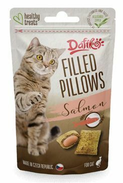 Pamlsek pro kočky ve formě plněných lososových polštářků.