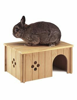 Dřevěný domeček pro králíky a jiná drobná zvířata. Rozměry 34,5 x 24 x 16,5 cm.