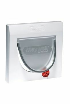 Bílá plastová dvířka s průhledným flapem a zámkem do plastových či dřevěných dveří.