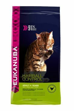 Krmivo Eukanuba Hairball Control 1+ obsahuje směs vlákniny z řepné dužiny a celulózy, do které se chlup v žaludku zachytí a je následně bezpečně vyloučen ve stolici.