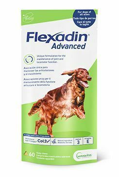 FlexadinÒ Advanced je unikátní výživový doplněk obsahující UC-II kolagen (nedenaturovaný kolagen typu II), který má prokazatelný účinek u psů s osteoartritidou, výtažek léčivé rostliny Boswellia serrata, která je známá pro svůj protizánětlivý účinek a další látky podporující metabolismus kloubů (mastné kyseliny omega 3 a omega 6, vitamin E).