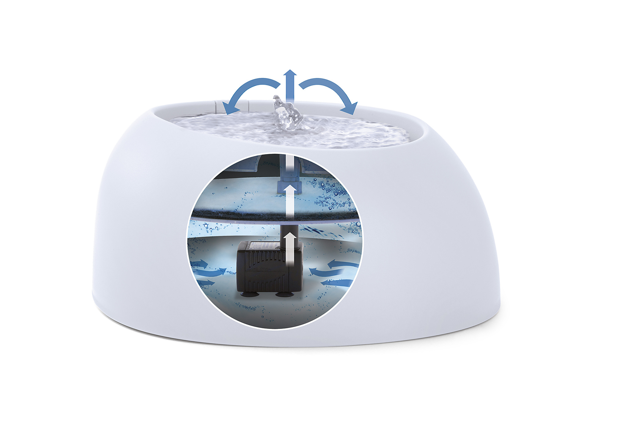 Fontána zajišťuje vašim mazlíčkům nepřetržitý přísun čerstvé vody. Je navržena tak, aby voda nepřetržitě tekla a stimulovala k častějšímu pití. Dostatečný pitný režim totiž udržuje zdravý organismus, především ledviny. Vodní fontána je dodávána s filtrem s aktivním uhlím, který udržuje vodu čistou a svěží. Filtr doporučujeme měnit jednou za měsíc. Protiskluzová guma udržuje fontánu pevně na jednom místě. Kapacita 2 litry.