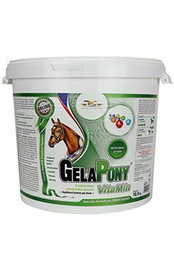 Komplexní doplňkové krmivo s obsahem kolagenu CHP, vitamínů a minerálů k dennímu obohacení krmné dávky všech kategorií koní Gelapony VitaMín je komplexní vitaminominerální doplněk s kolagenem CHP. Přípravek je určen k dennímu doplnění vitamínů a minerálních látek do krmné dávky koní. Současně zajišťuje příjem kolagenu CHP pro správný vývoj a regeneraci kloubů, kostí a šlach.