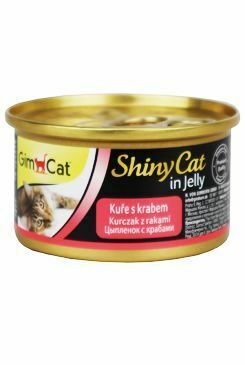 SHINY CAT - lahůdkové, čistě masové konzervy - pouze přírodní. V konzervě je vidět najemno nakrájené kuře a kraby.