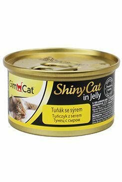 SHINY CAT - lahůdkové, čistě masové konzervy - pouze přírodní. V konzervě je vidět najemno nakrájený tuňák se sýrem.