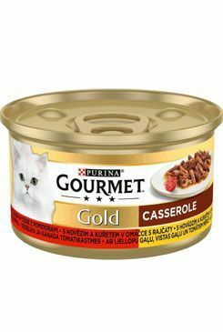 Kompletní, superprémiové krmivo Gourmet Gold konz. pro dospělé kočky všech plemen, s obsahem hovězího a kuřecího masa v rajské omáčce.