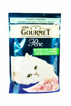 Kompletní krmivo Gourmet Perle pro dospělé kočky, mini filety marinované v aromatické a šťavnaté omáčce s lahodným španátem.