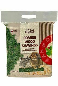 Hrubá hoblinová podestýlka určená pro zajícovce, hlodavce, koně, psy, vybraná terarijní zvířata a ptactvo s listy jahodníku, jakožto formou pamlsku.