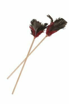 Mávátko s dřevěnou rukojetí a pravým pštrosím peřím, doplněné barevnými peříčky.