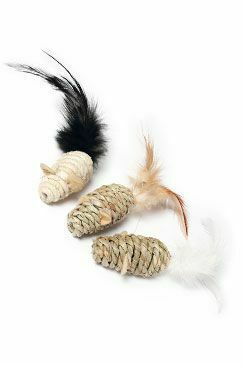 Hračka pro koťata i dospělé kočky, tři malé myšky s peřím vyrobené z pleteného lana.