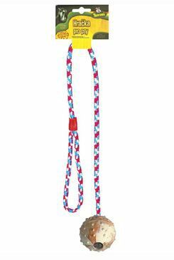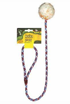 Skvělá aportovací hračka - odolný gumový míček na nylonové šňůře.