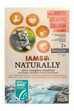Kapsička s masem z lososa v omáčce. 100 % kompletní a vyvážené krmivo pro kočičí seniory.