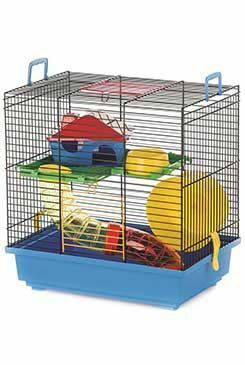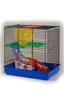 Vyšší klec pro drobné hlodavce s plastovým vybavením, které je její součástí.