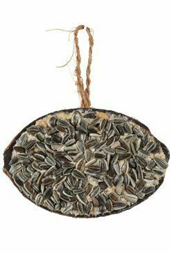 Kokosová skořápka plněná lojem a slunečnicovými semínky.