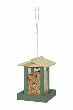 Závěsné krmítko na semena (650g) z certifikovaného borovicového dřeva a kovovým lankem pro větší odolnost. Vrchní plnění přes otvíratelnou stříšku.