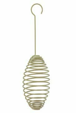 Závěsné kovové krmítko ve tvaru spirály na lojové koule. Výška spirály 15 cm.