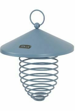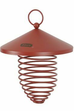 Závěsné kovové krmítko ve tvaru spirály, se stříškou, na lojové koule. Výška spirály 11 cm.