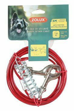 Uvazovací lanko zaručuje bezpečné přivázání psa v terénu, například na zahradě nebo na výletě. Vybaveno ocelovou karabinou a pružinou tlumící nárazy, poskytuje zvířeti velkou volnost pohybu a zároveň eliminuje riziko úniku. Vyrobeno z odolných materiálů nejvyšší kvality - ocelové lanko potažené červeným plastem. Má antistrečový systém a je vhodný pro psy vážící méně než 45 kg.