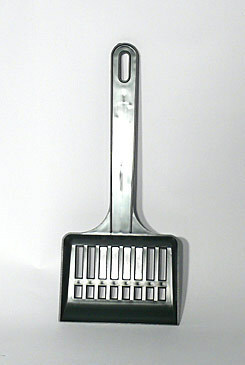 - Plastová lopatka s podélnými výřezy k odstraňování kočkolitu.