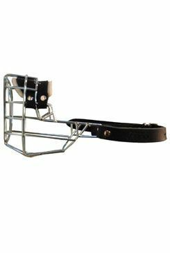 Náhubek se zinkovou povrchovou úpravou. Upínací řemínky jsou vyrobeny z kůže v černé barvě.