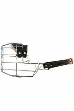 Náhubek se zinkovou povrchovou úpravou. Upínací řemínky jsou vyrobeny z kůže v černé barvě.