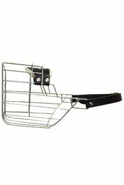 Náhubek se zinkovou povrchovou úpravou. Upínací řemínky jsou vyrobeny z kůže v černé barvě.