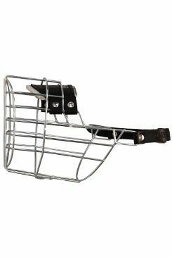 Náhubek se zinkovou povrchovou úpravou. Upínací řemínky jsou vyrobeny z kůže v černé barvě.