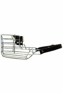 Náhubek se zinkovou povrchovou úpravou. Upínací řemínky jsou vyrobeny z kůže v černé barvě.