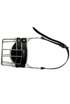 Náhubek se zinkovou povrchovou úpravou. Upínací řemínky jsou vyrobeny z kůže v černé barvě.