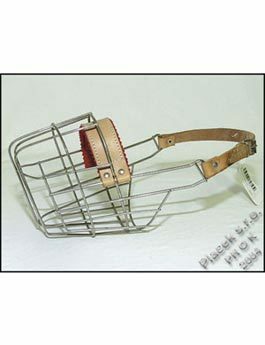 Kovový náhubek s koženými řemínky na zapínání pro kolii.