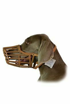 Náhubek umělohmotný, hnědý s koženým páskem.