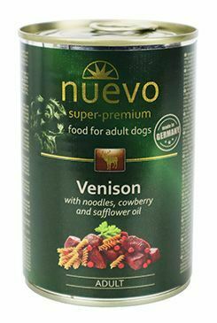 Konzerva Nuevo Zvěřinové menu je vhodná pro dospělé psy všech plemen, s obsahem zvěřiny, celozrnými nudlemi a brusinkami. Vysoký obsah masa společně s nudlemi a vynikajícím světlicovým olejem jsou tím nejlepším z této receptury. Světlicový olej podporuje zdravý kožich díky dokonalé kombinaci esenciálních mastných kyselin a podněcuje dobré trávení.
