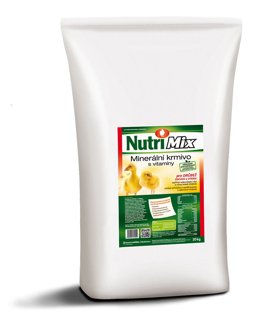 Minerální krmivo s vitaminy pro výkrm a odchov drůbeže. Vitamino-minerální směs NUTRI MIX je určena pro drobnochovatele a malochovy. Přidává se do krmné dávky drůbeže, kterou tvoří převážně obilné šroty, kuchyňské zbytky a další domácí krmiva. Obsahuje biologicky účinné látky – vitamíny, minerální látky a aminokyseliny. Tato směs umožňuje chovatelům dokompletovat neplnohodnotnou krmnou dávku na potřebnou úroveň a zajistit tak zlepšení příjmu a využitelnosti krmiva, zvýšení přírůstků a udržení dobrého zdravotního stavu mladé drůbeže.