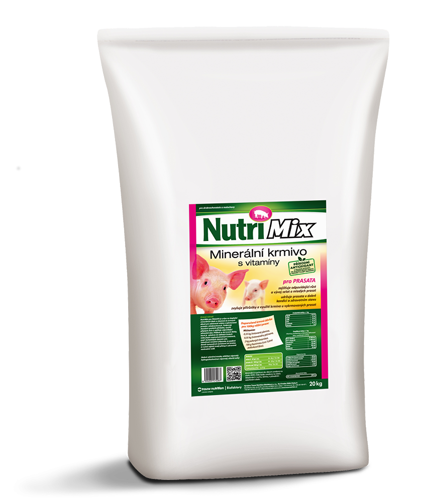 Minerální krmivo s vitaminy pro prasata selata. Vitamino-minerální směs NUTRIMIX je určena pro drobnochovatele a malochovy. Přidává se do krmné dávky selat a prasat, kterou tvoří převážně obilné šroty, kuchyňské zbytky a další domácí krmiva. Obsahuje biologicky účinné látky – vitamíny, minerální látky a aminokyseliny. Tato směs umožňuje chovatelům dokompletovat neplnohodnotnou krmnou dávku na potřebnou úroveň a zajistit tak vyšší přírůstky hmotnosti, zlepšení příjmu a využitelnosti krmiva, udržení dobrého zdravotního stavu prasat a omezení výskytu poruch pohybového aparátu.