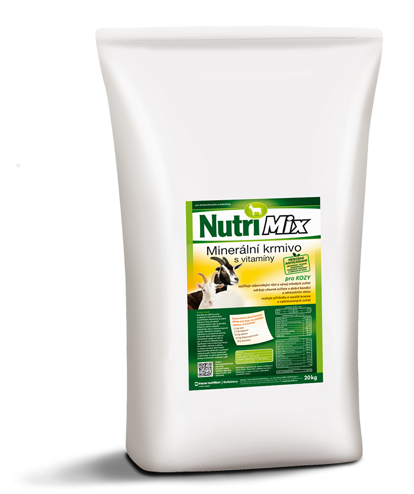 Krmný návod: NutriMix je určen na doplnění minerálních látek a potřebných vitaminů do krmných dávek pro kozy chovaných v drobnochovech nebo na farmách. Přispívá k udržení dobrého zdravotního stavu a životaschopnosti mláďat. Odměřené množství přípravku se rovnoměrně zamíchá do krmné dávky (jádra) nebo se rovnoměrně nasype na žlab na píci. Je určen ke každodennímu doplňování méně hodnotných krmiv. Na počátku odchovu a výkrmu je vhodné používat dolní hranici doporučeného dávkování a postupně zvyšovat podle rostoucí hmotnosti a stáří zvířat. Je nutné zajistit trvalý přístup k zdravotně nezávadné vodě.
