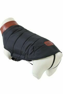 Nepromokavá prošívaná trendy bunda je velmi pohodlná. V oblasti krku a hrudníku je nastavitelné pružné zapínání na suchý zip. Límec a nášivka na zádech s nápisem DOG ze syntetické hnědé kůže. Obleček má intergrované otvory na vodítko a na nohy.