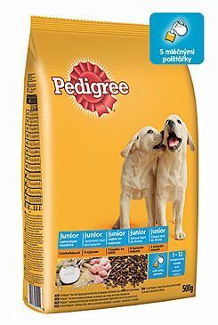Kompletní krmivo pro štěňata z obilovin, masa a produktů živočišného původu.