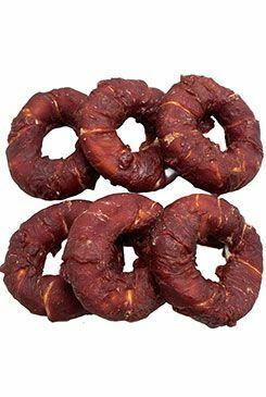 Donut z bílé buvolí kůže obalený kachním masem. Pro psy.