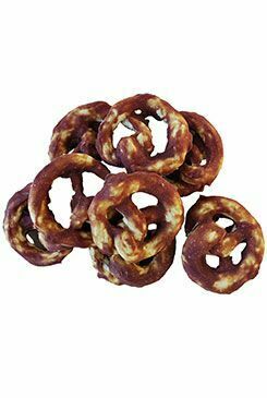 Donut z bílé buvolí kůže obalený kachním masem. Pro psy.