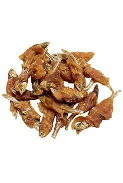 Masová pochoutka pro psy a kočky, rybičky omotané kuřecím masem.