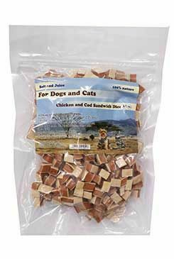 Kuře s treskou sandwich slabé proužky pro psy a kočky.
