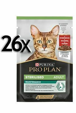 Balení 24 kusů kapsiček s hovězí příchutí pro sterilizované nebo kastrované kočky. Kompletní krmivo.