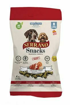 Mediterranean Natural Serrano Snacks, pamlsky delikátně rozkrájené na malé kousky ve tvaru kosti, zaručují bezpečnost vašeho čtyřnohého přítele, přičemž zachovávají všechny živiny, respektují přirozenou stravu a obsahují 70% čerstvého masa.