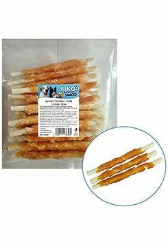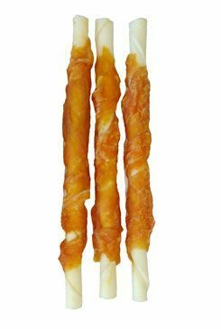 Doplňkové krmivo pro psy - pamlsek lisovaný z kůže, obalený sušeným kuřecím masem.