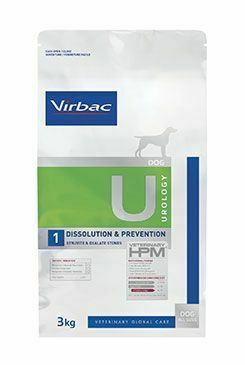 Dietní suché krmivo Virbac se vyznačuje vlastnostmi alkalizujícími moč. Spolu s nízkou hladinou vápníku a vitaminu D může pomoci snížit tvorbu oxalátových kamenů. Virbac Veterinary HPM Dog Urology Dissolution & Prevention U1 má také nízký obsah hořčíku, který snižuje tvorbu nových struvitových kamenů a podporuje jejich rozpouštění.