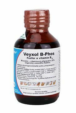 Emulze na minerální bázi obsahující fosfor a vitamín B12. Veyxol B-Phos 100ml z kategorie Vitamíny pro hospodářská zvířata Veyx . Emulze na minerální bázi obsahující fosfor a vitamín B12. Doplnění výživové potřeby organismu. Podává se v období zvýšené zátěže (porod, transport, teplotní výkyvy).